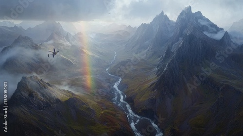 Naklejka premium Majestic mountain landscape with dramatic sky and rainbow in vast wilderness...