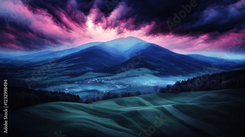 © LofiCat, Fototapeta premium Majestic Mountain Landscape with Dramatic Sky and Rolling Hills