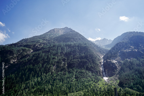 Naklejka premium Majestic Mountain Landscape with Forested Peaks and Clear Blue Sky..