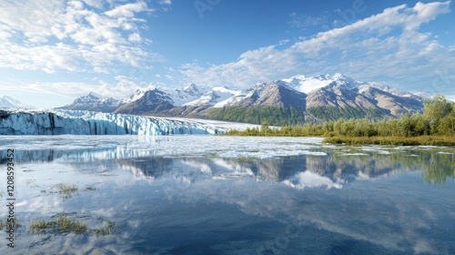 © peppastocker, Obraz premium Majestic mountain landscape with glacier and reflective lake under blue sky
