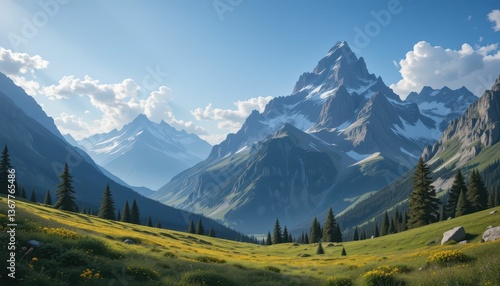 © Kitta Studio, Fototapeta premium Majestic Mountain Landscape with Green Valley and Blue Sky