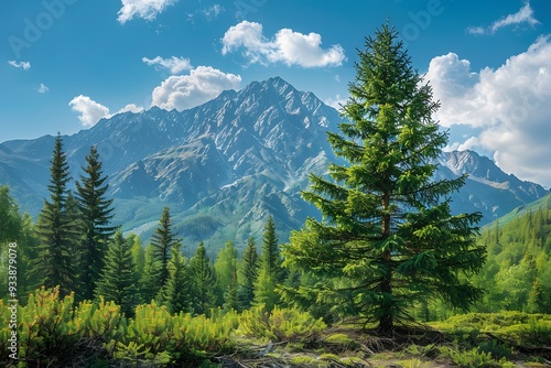 Fototapeta premium Majestic Mountain Landscape with Lush Greenery and Pine Trees
