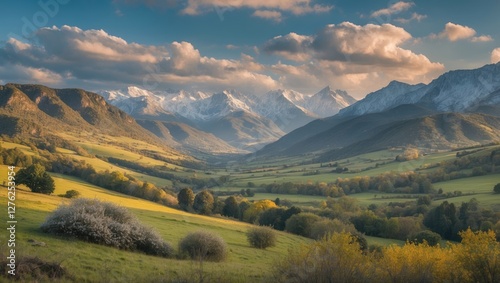 Naklejka premium Majestic mountain landscape with lush valleys and vibrant autumn foliage...