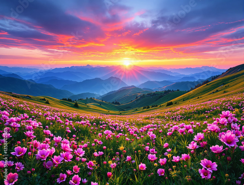© VideoFlow, Fototapeta premium Majestic mountain landscape with pink wildflowers under a colorful sunset sky. Rolling hills and distant peaks create a peaceful nature background. Ai generative