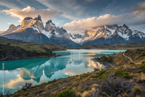 © DesignerKamran99, Naklejka premium Majestic Mountain Landscape with Reflective Water and Lush Greenery