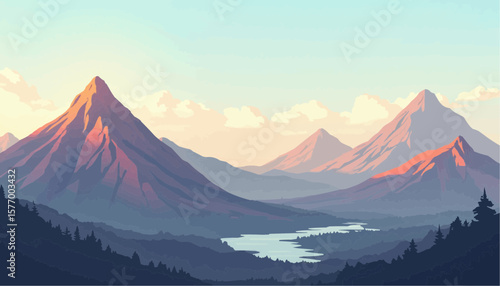 Naklejka premium Majestic Mountain Landscape with River and Forest in Soft Pastel Colors