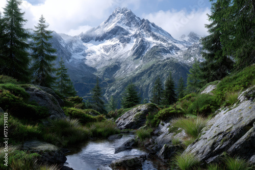 Obraz premium Majestic mountain landscape with serene stream and lush greenery in daylight
