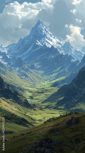 Fototapeta premium Majestic Mountain Landscape With Verdant Valley and Dramatic Sky