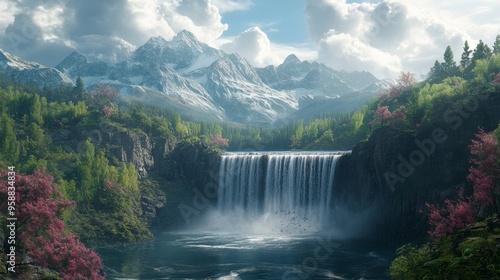 © Sandu, Fototapeta premium Majestic Mountain Landscape with Waterfall