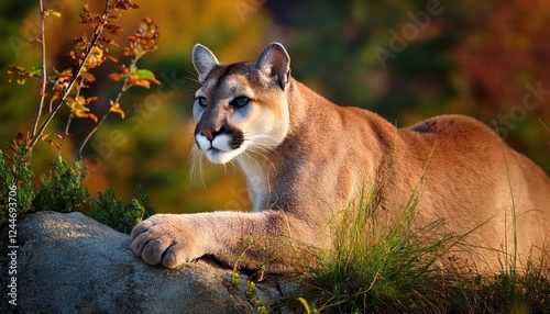 Fototapeta premium Majestic Mountain Lion Encountered in the Serene Wilderness, Captured by a...
