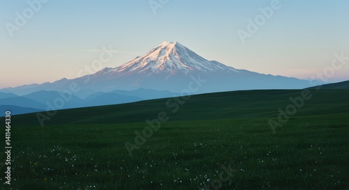 © Tadeu, Naklejka premium Majestic Mountain Majesty: A breathtaking view of a snow-capped mountain peak rising majestically against a pale blue sky, its slopes receding into the distance, bathed in the soft.