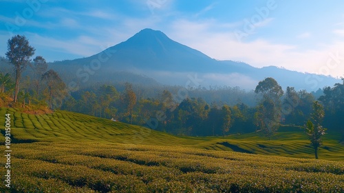 Fototapeta premium Majestic Mountain Overlooking Lush Tea Fields in Early Morning Light,...