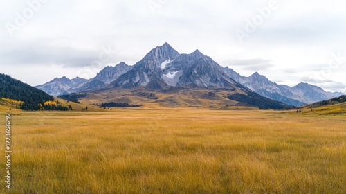 © BROPRADANA, Fototapeta premium Majestic mountain peak autumn meadow landscape, travel postcard