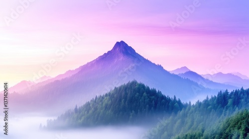 Fototapeta premium Majestic mountain peak bathed in sunrise hues, misty valley below