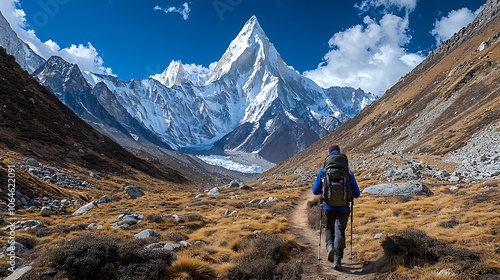 © theerachai, Fototapeta premium Majestic Mountain Peak Hike Adventurous Traveler with Backpack and Trekking Poles