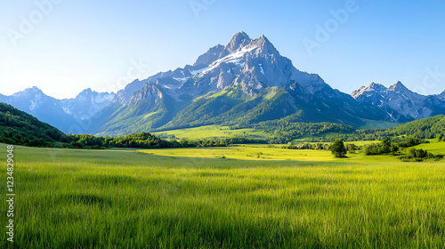 Fototapeta premium Majestic mountain peak overlooking green valley, sunny day