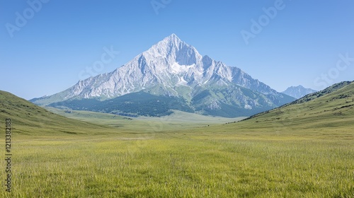 Fototapeta premium Majestic mountain peak overlooking vast green valley, summer landscape