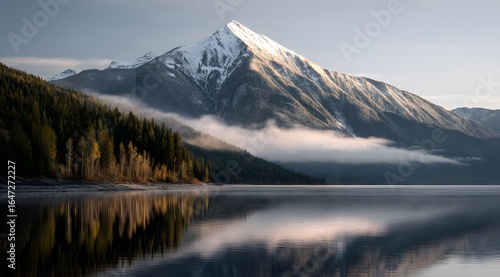 Naklejka premium Majestic mountain peak reflected in tranquil lake, surrounded by lush forest and shrouded in soft morning mist, creating a serene and picturesque landscape