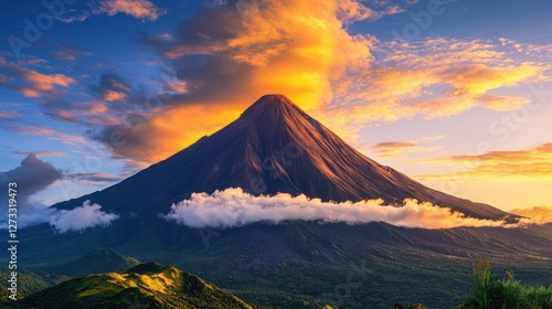 © Penatic Studio, Fototapeta premium Majestic mountain peak surrounded by dramatic clouds at sunset