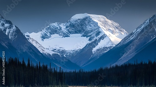 Fototapeta premium Majestic Mountain Peak with Snow Covered Summit and Evergreen Forest