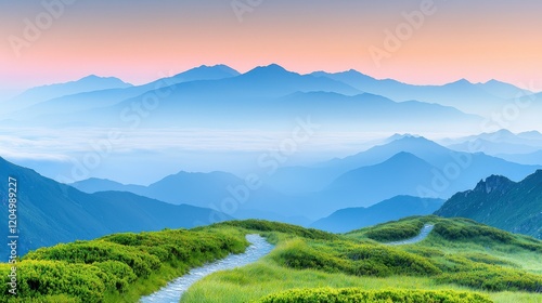 © xbzz, Obraz premium Majestic mountain peaks at dusk panoramic landscape soft light illuminating valleys serene environment