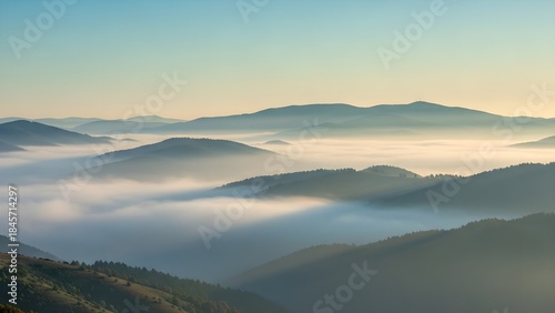 © Mukha, Obraz premium Majestic mountain peaks emerge above a breathtaking sea of clouds, illuminated by the gentle golden light of dawn, creating a serene and expansive natural landscape vista