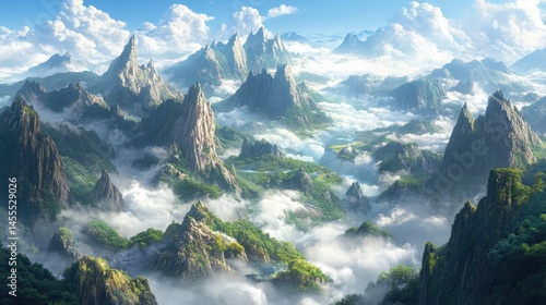 © ajib ajib, Naklejka premium Majestic mountain peaks piercing through ethereal clouds, scenic vista