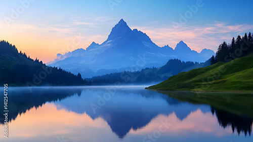 © artzone, Fototapeta premium Majestic Mountain Peaks Reflecting In Calm Lakeside Sunrise