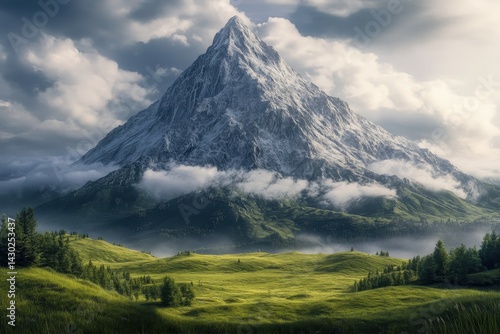 © YouraPechkin, Fototapeta premium Majestic mountain peaks rise above lush green valleys under cloudy skies