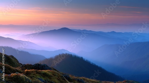 Fototapeta premium Majestic mountain range at dawn showcases layers of peaks shrouded in mist, creating a serene landscape with a soft, pastel-colored sky and a sense of depth and tranquility.
