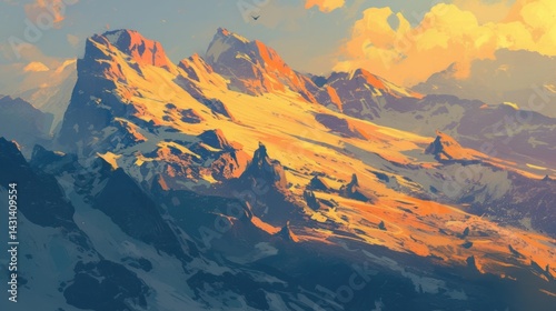 © Pianart, Obraz premium Majestic mountain range at golden sunset. Snowy peaks, dramatic light