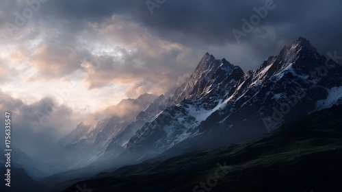 Fototapeta premium Majestic mountain range at sunrise illuminated by dramatic clouds and golden light with snow capped peaks