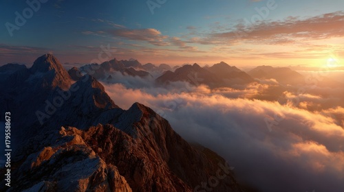 Naklejka premium Majestic mountain range at sunrise over clouds
