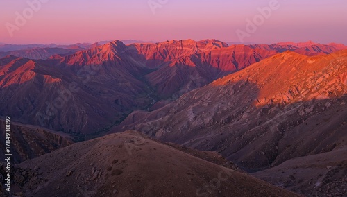 Fototapeta premium Majestic mountain range bathed in warm, vibrant sunset glow, evoking peace...