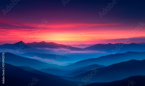 © dewpra, Fototapeta premium Majestic mountain range landscape illuminated by colorful sunset sky in horizon view