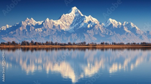 Naklejka premium Majestic mountain range reflected in calm lake, serene autumn landscape