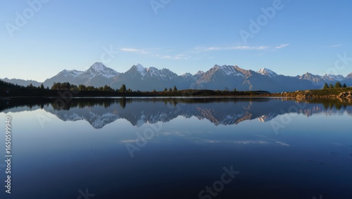 © Haidar, Fototapeta premium Majestic Mountain Range Reflected in Calm Lake Under Clear Blue Sky