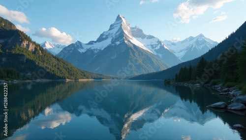 © Theerawat, Fototapeta premium Majestic mountain range reflected in calm river, blue, dusk