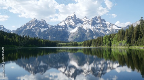 © Daphne, Fototapeta premium Majestic mountain range reflected in pristine lake under clear blue sky