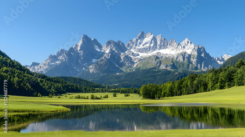 Fototapeta premium Majestic Mountain Range Reflecting In Calm Lake Under Clear Blue Sky With Green Valley In Daylight