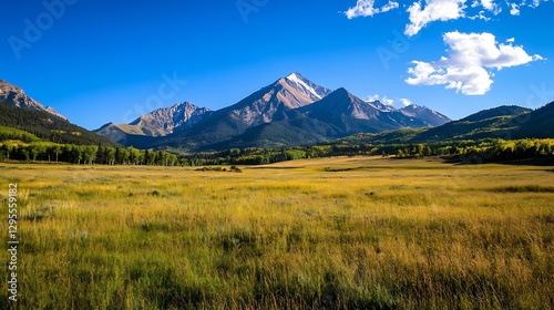© Generative AI, Naklejka premium Majestic mountain range standing tall over expansive golden fields under a clear blue sky : Generative AI