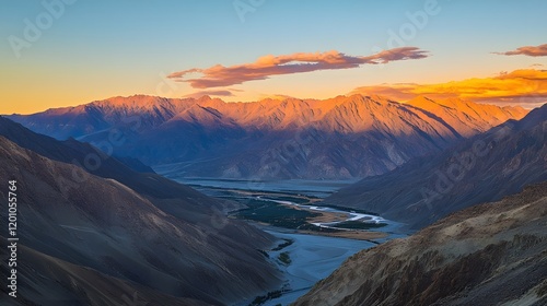 Obraz premium Majestic Mountain Range Sunset Valley River Scene