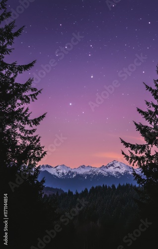 Fototapeta premium Majestic Mountain Range under a Purple Starry Night Sky with Pine Trees
