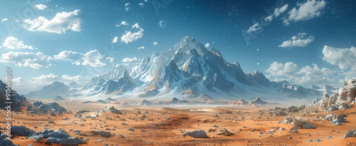Fototapeta premium Majestic mountain range under a starry sky with a visible moon, amidst a vast desert landscape.