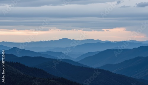 © benjamas, Obraz premium Majestic Mountain Range Under Soft Clouds at Dusk with a Beautiful Horizon View