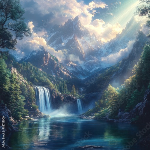 © novian, Fototapeta premium Majestic Mountain Range with a Cascading Waterfall and a Tranquil Lake