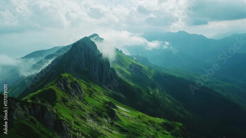 Fototapeta premium Majestic Mountain Range with Clouds and Lush Green Slopes Panoramic Landscape...