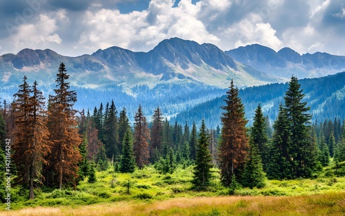 © sahina, Obraz premium Majestic Mountain Range with Evergreen Forest Landscape