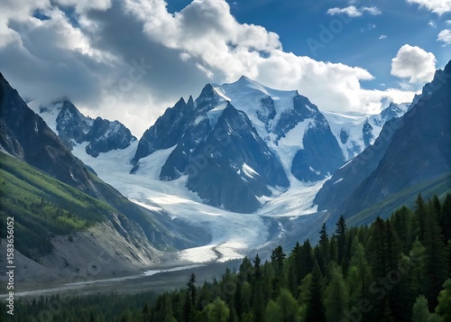 Fototapeta premium Majestic mountain range with glacier and forest high resolution photo