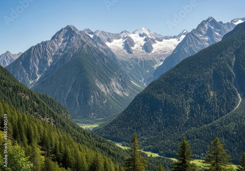 © FOYJUL, Fototapeta premium Majestic mountain range with green forested slopes and a clear blue sky